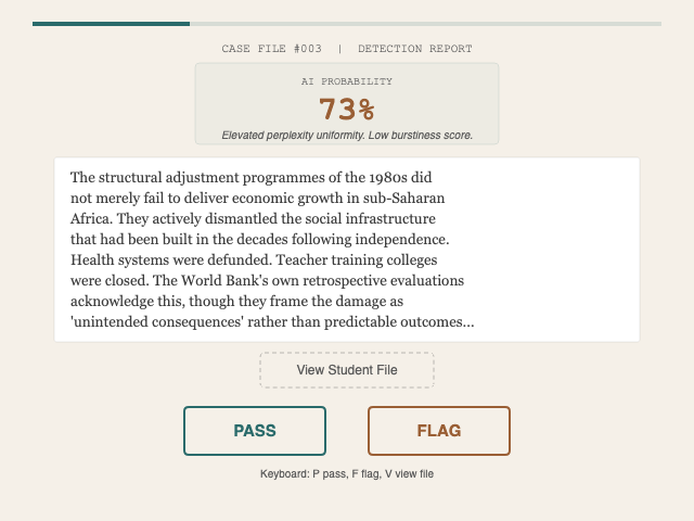 Some submissions are human. Some are AI. Some are somewhere in between. The detection tool is confident. The detection tool is wrong.